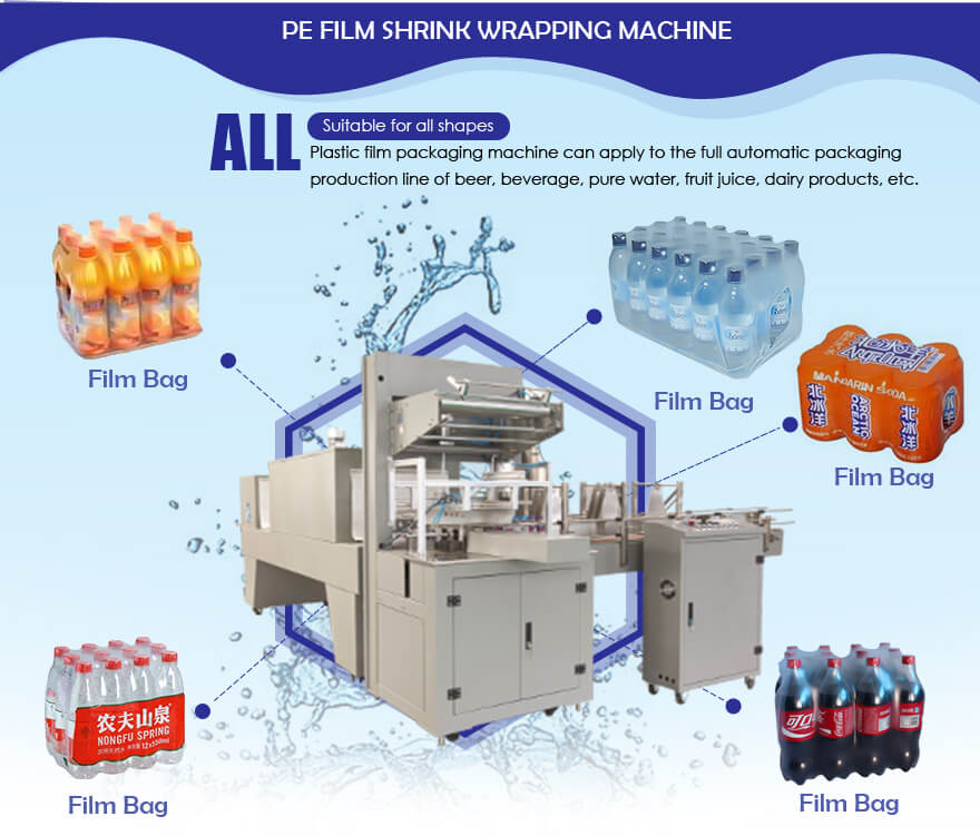 Эта машина специально разработана для упаковки пива, безалкогольных напитков, фруктовых соков, воды в бутылках, молочных продуктов, приправ и т. д. С нижней опорой или без нее.