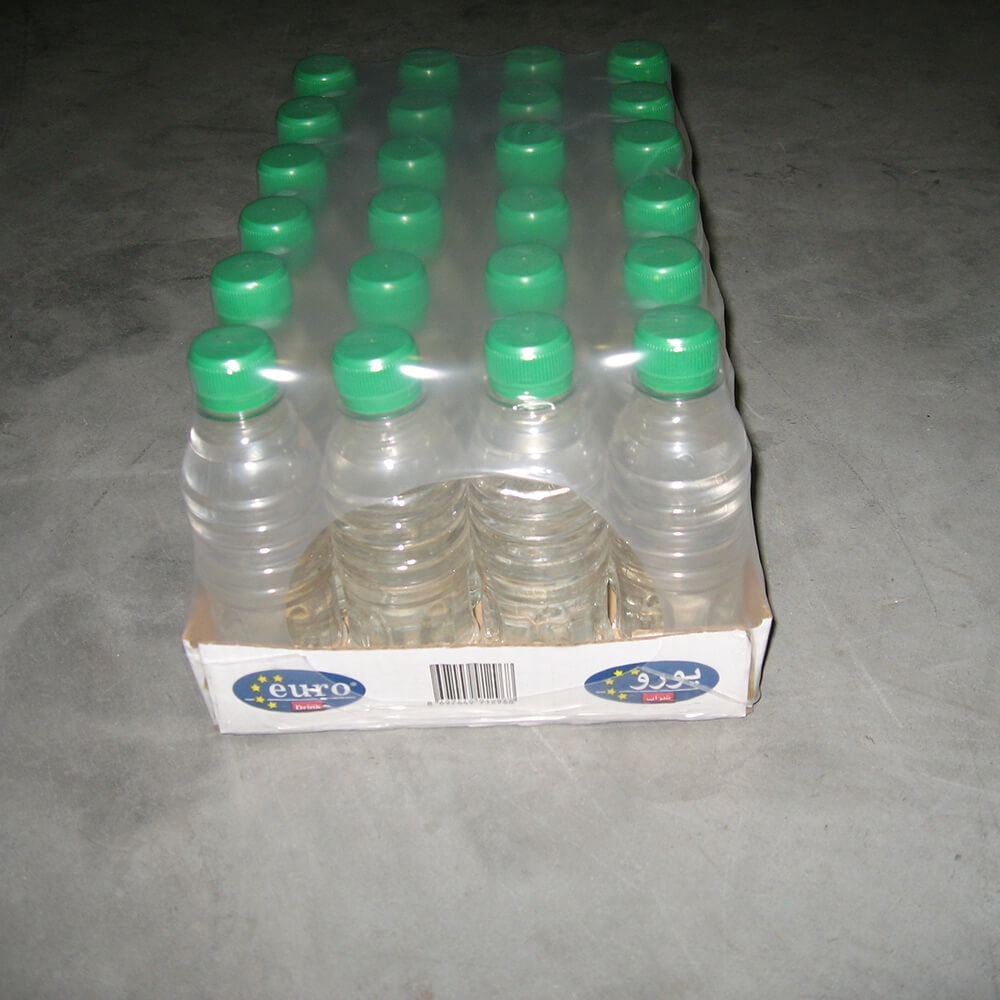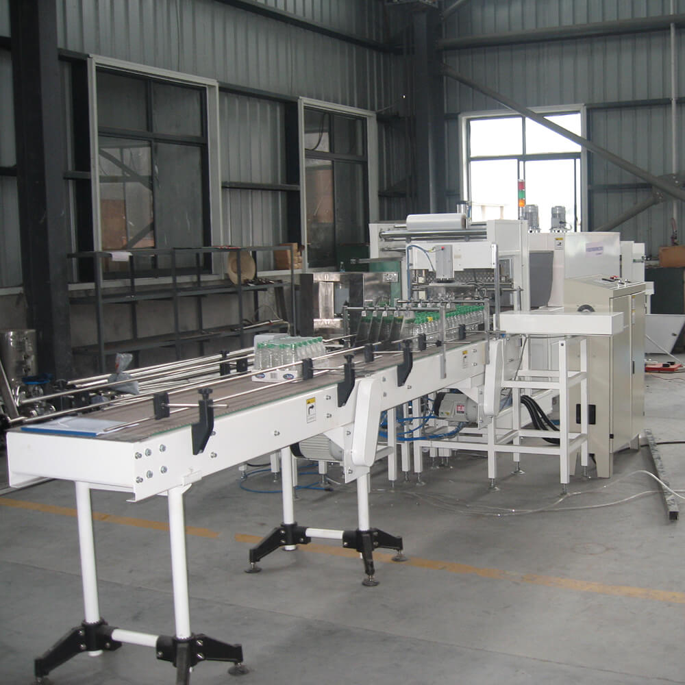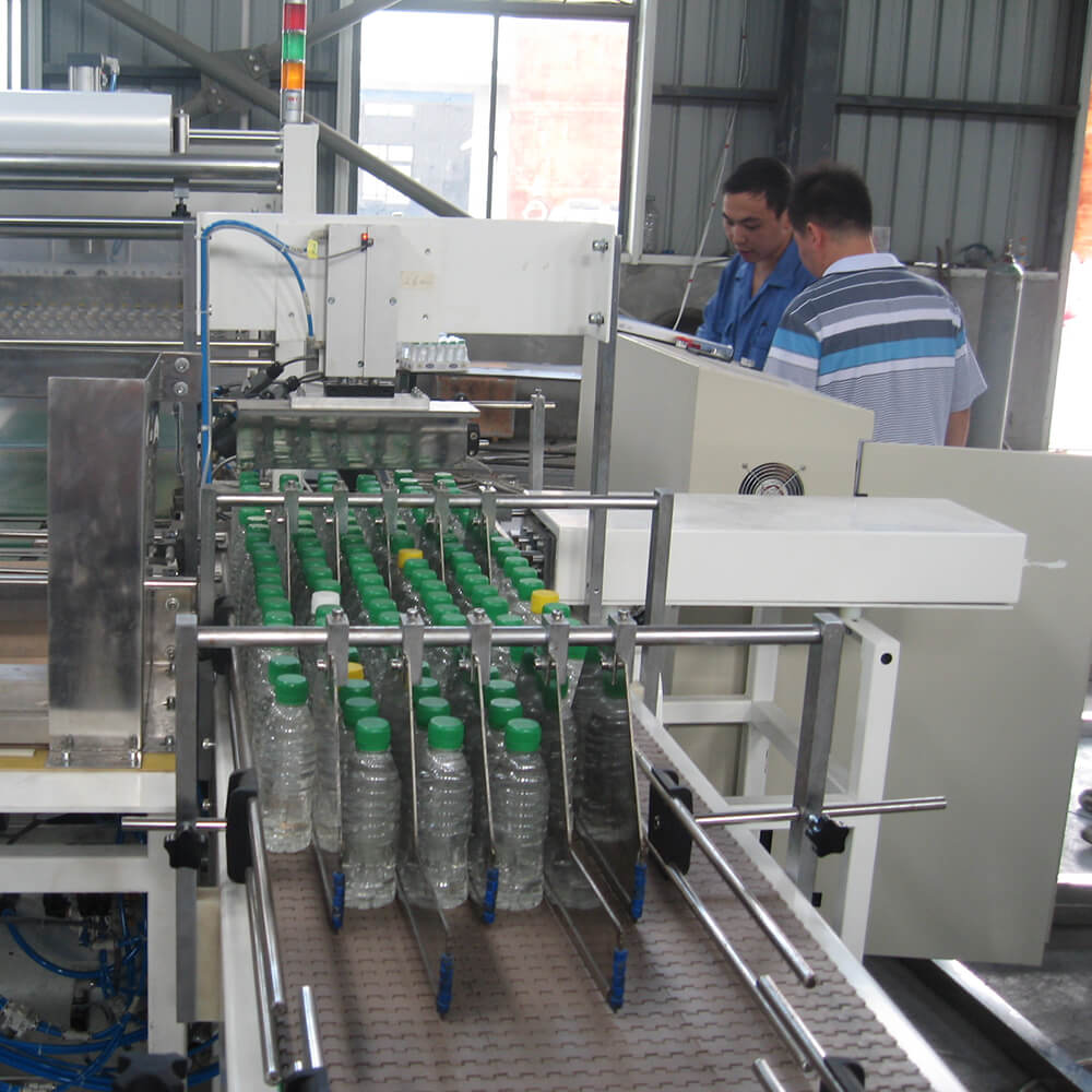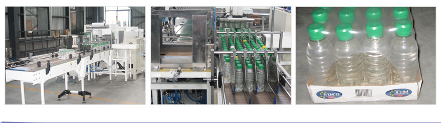 Соединительная производственная линия → Буферный конвейер→ Группирование бутылок → Автоматическая подача бумажного лотка → Формирование поддона → Обертывание пленкой → Термоусадочный туннель → Охладительный туннель.